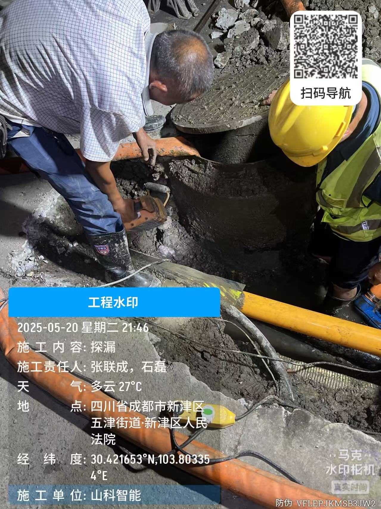 四川新津海天水司漏點周圍環境復雜,埋深較高,300口徑鑄鐵管道,埋深1.5米,周圍有煤氣管道和廢舊水管,極其影響判斷,依靠山科漏損漏損團隊的經驗及先進設備,成功找到漏點,進行開挖。