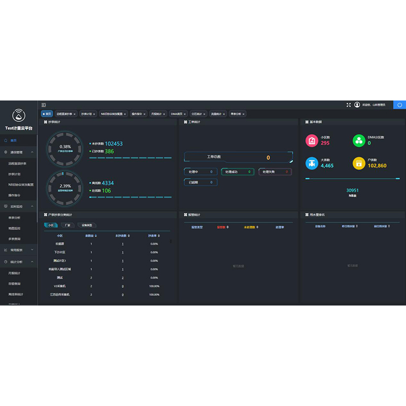 管理在線儀表(包括大口徑水表、流量計、壓力儀、濁度儀、余氯儀、PH儀和消防栓等),進行實時監控、數據采集和分析管理,及時發現大用戶異常用水和水表運行異常等情況,實時監控分析管網壓力、水質、消防用水等,從深層次發現供水管網運行情況。